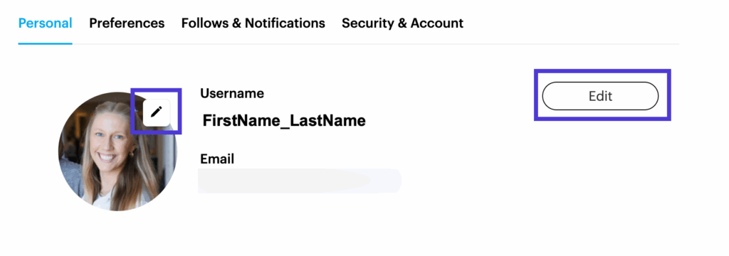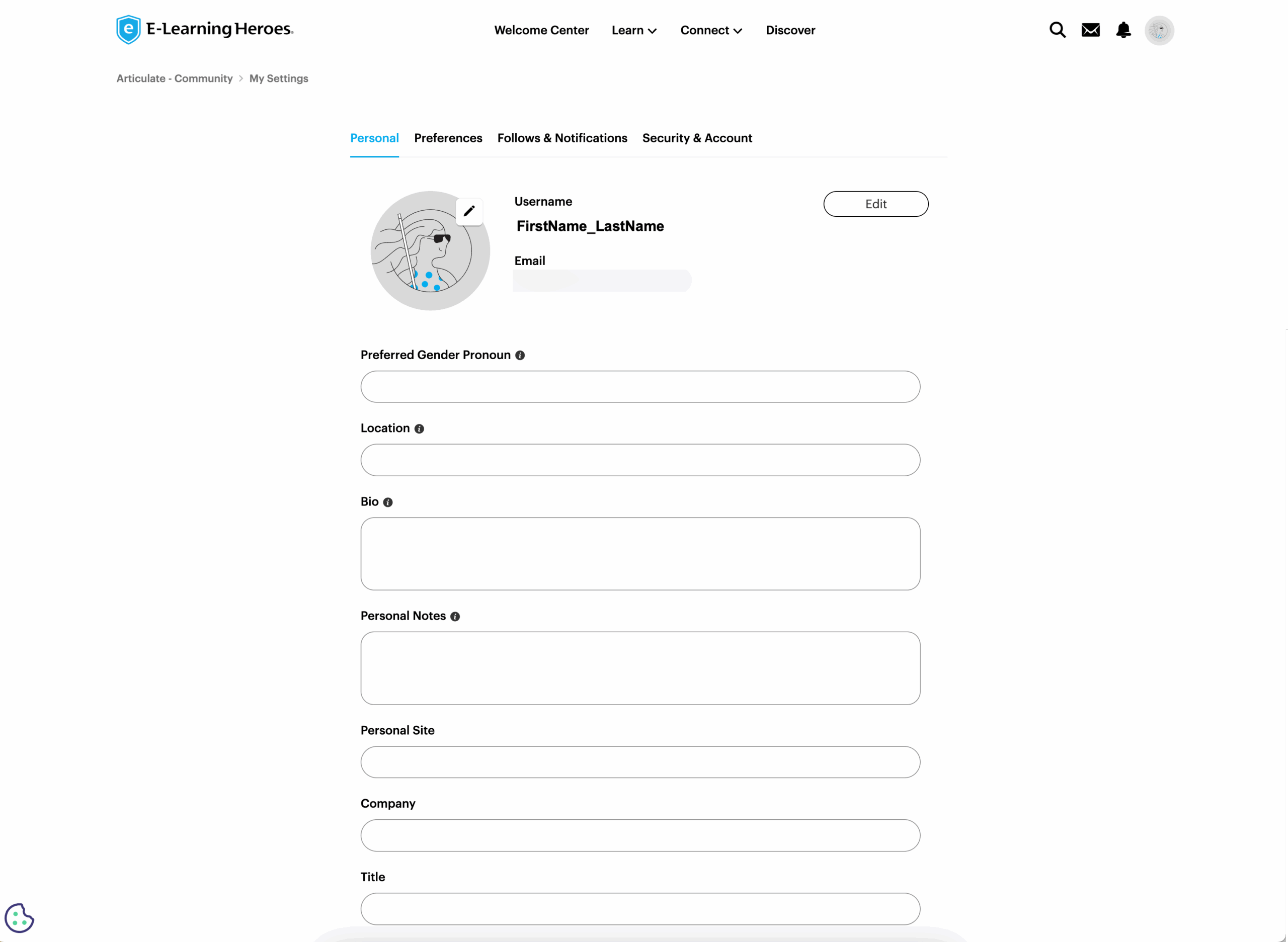 - Sélectionnez le bouton Edit (Modifier) pour modifier votre nom d’utilisateur. Nous vous recommandons d’utiliser votre vrai nom. Vous ne pourrez pas modifier votre adresse e-mail, car elle est liée à votre abonnement Articulate 360.