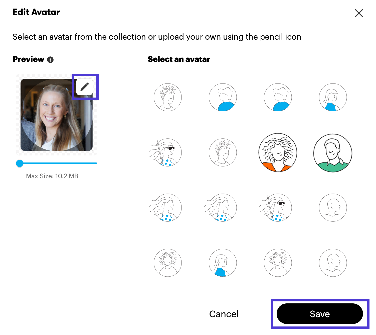 - Nous vous recommandons de télécharger une photo de vous ou une icône. Pour ce faire, sélectionnez l’icône en forme de crayon dans la section d’aperçu. N’oubliez pas de cliquer sur Save (Enregistrer) !