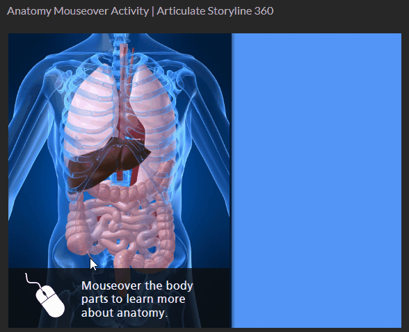 - Afficher des informations supplémentaires : de nombreuses personnes utilisent le survol de la souris pour agrandir l’affichage. Survolez un objet pour accéder rapidement à des informations. Éloignez-vous de l’objet pour masquer les informations. Dans l’exemple ci-dessous, l’interaction au survol de la souris permet à l’apprenant d’explorer l’anatomie humaine.