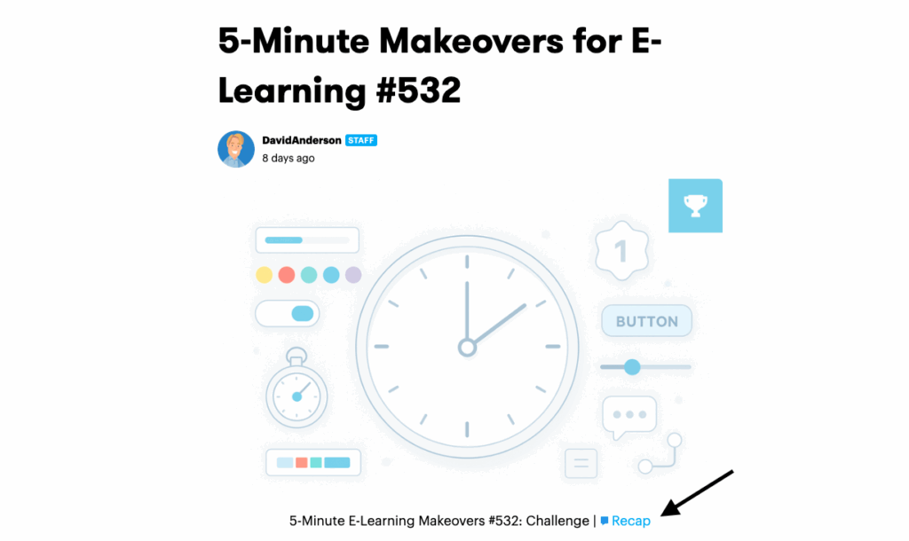 Saviez-vous que chaque semaine, sur E-Learning Heroes, notre collègue David Anderson invite les membres de la communauté à réaliser des mini-projets autour d’un thème différent ? Si ce n’était pas le cas, vous le savez maintenant ! Poursuivez votre lecture pour découvrir pourquoi et comment participer.